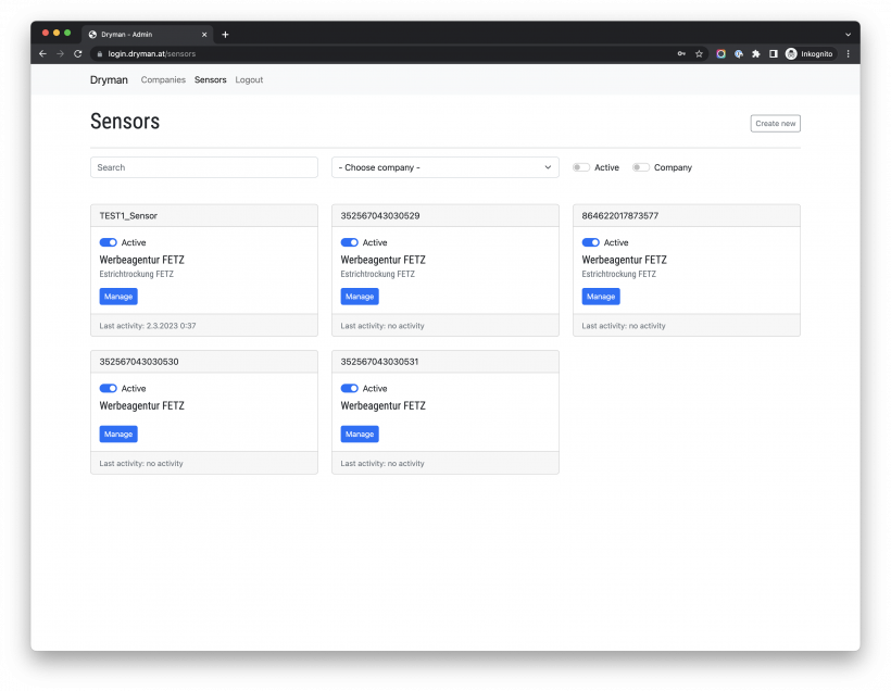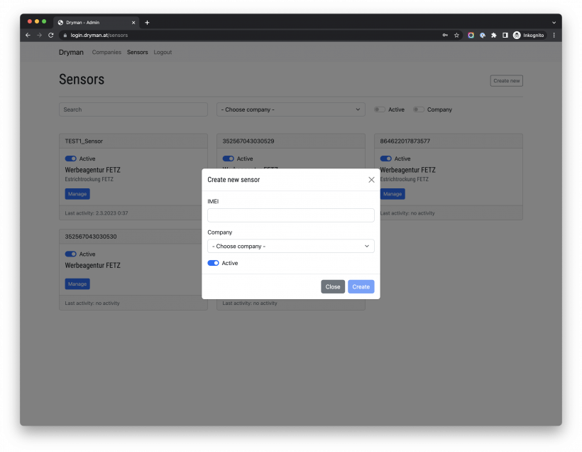 Die IMEI Nummer ist gleichzeitig die Bezeichnung des Sensors. Beim Anlegen kann man auch bestimmen, ob dieser gleich einem Kunden zugewiesen werden soll.