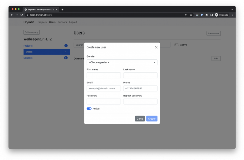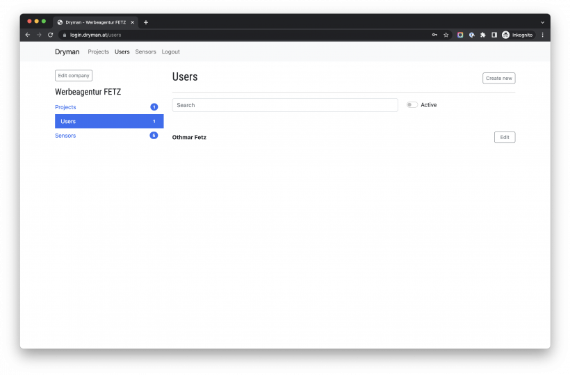Benutzer einer Firma erhalten Zugriff auf die Projekte, deren Bereiche und können Sensordaten auslesen. Allerdings keine Projekte, Bereiche oder Sensoren administrieren, bearbeiten, verknüpfen oder löschen.