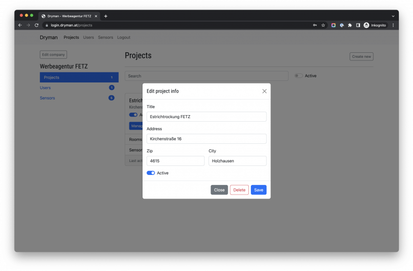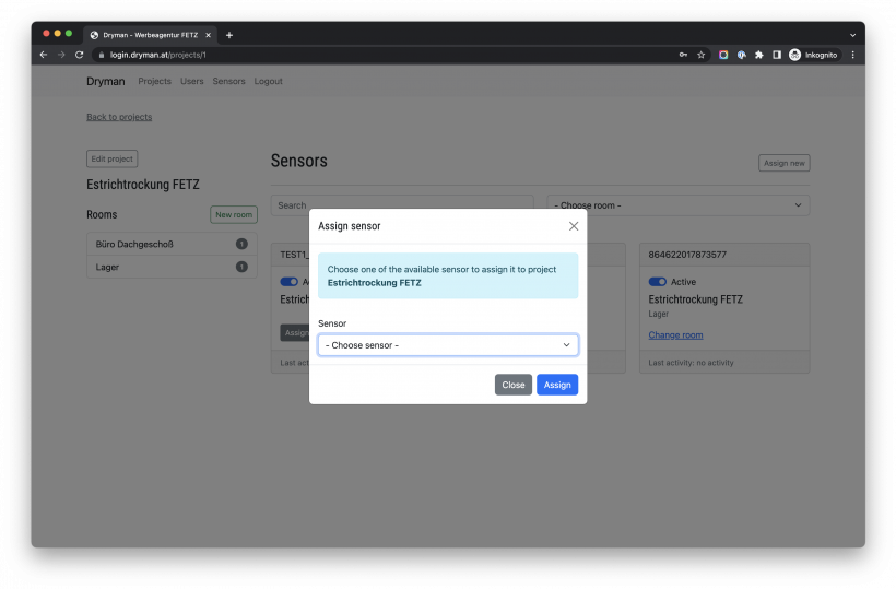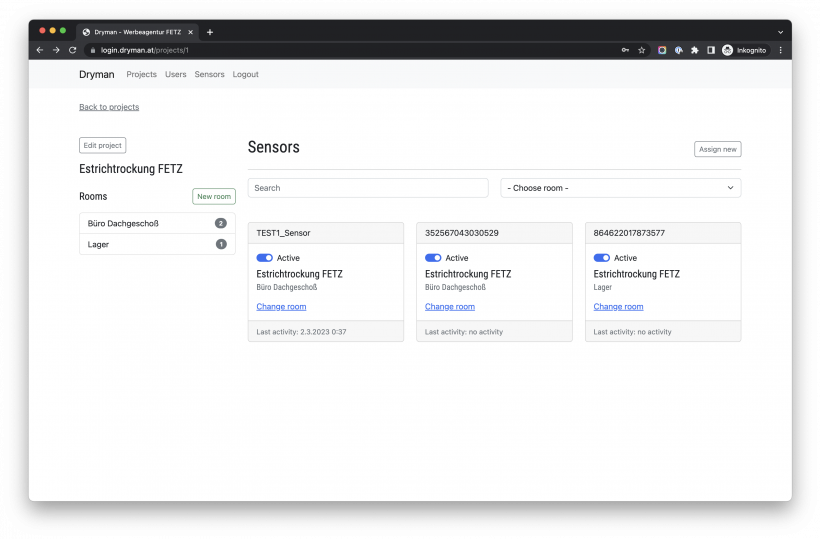 Projekt Ein Projekt kann einen oder mehrere Bereiche / Räume haben, denen Sensoren zugeordnet sind. #Projektübersicht #Projektdetails #Sensor dem Projekt zuordnen