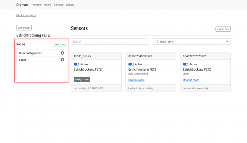 Jedes Projekt beinhaltet mehrere Räume bzw. Bereiche um Sensoren so besser verorten zu können. In jedem Projekt können beliebig viele Räume angelegt werden. Jeder Raum kann beliebig viele Sensoren beinhalten