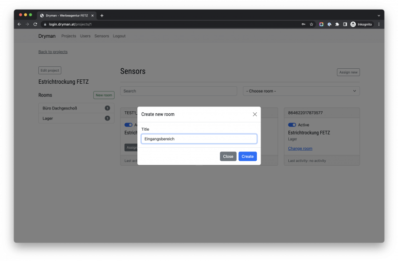 Administrator von Firmen können beliebig viele Räume pro Projekt anlegen indem sie einen Namen vergeben. Die Zuordnung der Sensoren folgt im nächsten Schritt