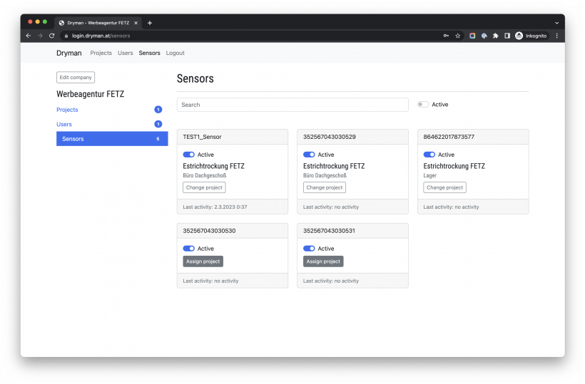 Firmen stehen die Sensoren zur Verfügung, die vom Administrator zugewiesen wurden. Firmen können keine eigenen Sensoren anlegen.