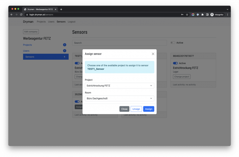 Sensoren können direkt von der Seite Projekten oder Räumen zugewiesen werden